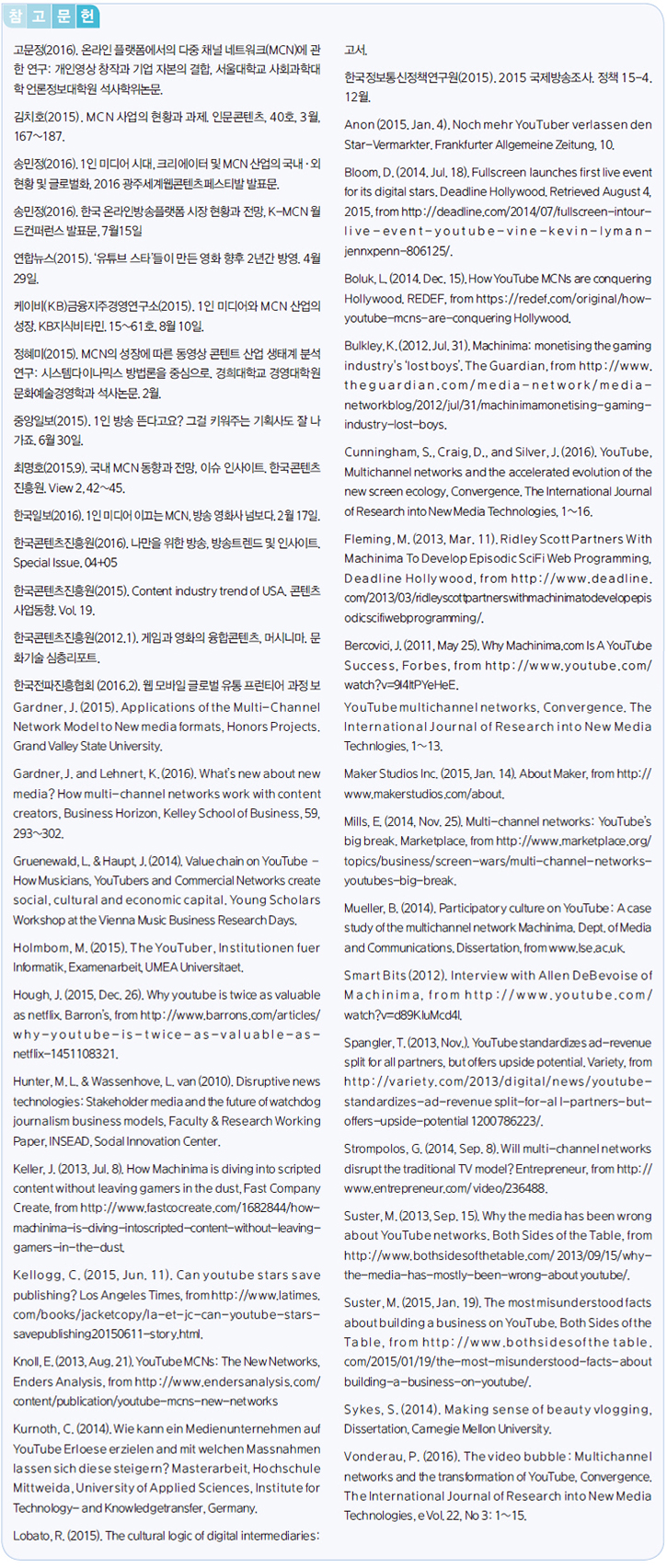 국내에서도 MCN이 등장, 1인 창작자와 제휴해 콘텐츠 기획, 마케팅, 프로모션, 제작시설/장비, 홍보, 교육, 광고, 저작권, 수익관리 등 제작에 필요한 전 과정을 체계적으로 지원해 창작자가 제작에 집중할 수 있도록 돕는 연예기획사 역할을 수행한다(최명호 2015).