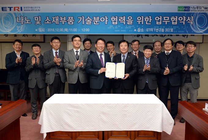 ETRI는 첨단 나노장비 인프라 기관인 나노종합기술원과 ‘나노 및 소재부품 관련 기술협력’을 위한 업무협정을 체결했다고 8일 밝혔다.