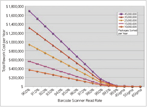 새로운 바코드 판독 시스템에 10만 달러를 투자함으로써 수동으로 재작업을 해야 하거나 분류 장비로 다시 보내야 하는 패키지의 수가 하루 1,141개, 연간 39만9,350개로 감소했다.