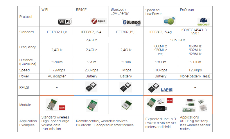 로옴 그룹은 다양한 근거리 무선 통신 방식에 대응할 수 있는 라인업을 구비하고 있다(표 1). 근거리 무선 통신에도 다양한 종류가 있으므로, 어디에 센서를 설치하고 어떻게 동작시키는가에 따라 최적의 방식을 선택할 필요가 있다. 또한, 접속성도 배려할 필요가 있기 때문에 다음과 같은 항목을 염두에 두고 라인업화를 추진하고 있다.