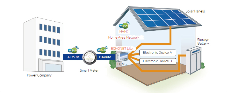 ‘Wi-SUN’이란 Wireless Smart Utility Network의 약자로, 최대 약 1km 정도 거리에서 상호 통신을 실행하는 저전력 무선 통신 규격이다. 물리층 IEEE802.15.4g, MAC층 IEEE802.15.4e로 규격화되어 있으며, 스마트미터(차세대 전력량계)용 무선 방식으로서 인증받고 있다. 또한, 스마트미터 및 가정용 에너지 관리 시스템(HEMS)과, 가전제품 등을 연계하는 Home Area Network용으로 ‘Wi-SUN HAN’도 책정되어 있으며, 2016년 4월부터 전력 자유화에 따른 스마트미터가 설치 확대됨에 따라 컨트롤러 기기에 대한 탑재가 추진되는 무선 통신 방식이다(그림 1). 기존에는 제조사에 의존하던 가정 내 기기의 연계가 오픈된 통신 규격으로 실현 가능해짐에 따라, 소비자는 제조사에 상관없이 편리성을 누릴 수 있다.
