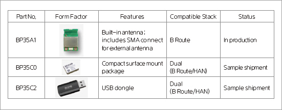 대응 무선 통신 모듈을 제품화했으며, 관련 제품이 스마트미터 및 게이트웨이에 채용되고 있다. 일본 내 전파법의 인증 취득뿐 아니라, Wi-SUN 얼라이언스가 운영하는 상호 접속 시험의 기준기 인증도 취득(CTBU: Certified Test Bed Unit)하여, 안심하고 도입할 수 있는 디바이스이다. Wi-SUN B루트에 대응 가능한 BP35A1을 이미 양산화했으며, 차세대 제품으로서 Wi-SUN B루트/HAN에 모두 대응하는 BP35C0, BP35C2의 샘플 출하를 개시했다. BP35C0은 소형화를 추구한 면 실장 타입, BP35C2는 USB 동글 타입으로 USB 포트를 탑재한 기존 게이트웨이에서 하드웨어를 변경하지 않고도 Wi-SUN 통신을 실현할 수 있다 (표 2).