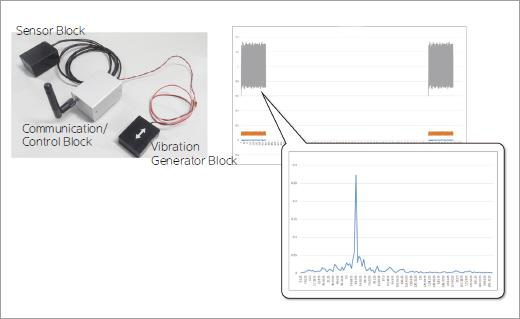 가속도를 검지하여 장치의 진동을 모니터링하는 시스템에서 저소비 EnOcean 무선 통신과 진동 발전 소자, 전류 발전 소자 조합, 배터리 및 배선 없는 센서노드를 구축했다. 이처럼 센서노드를 배선 없이 구성할 경우 추가 탑재가 용이하고 설치 공사를 생략할 수 있으므로, 기존 설비에 센서를 추가할 때의 부담이 크게 경감되어 공장 전체의 센서 네트워크 구축에 기여할 수 있다.