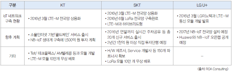 ▲ 표 2. 주요 통신사업자 3사의 IoT 네트워크 제공 현황