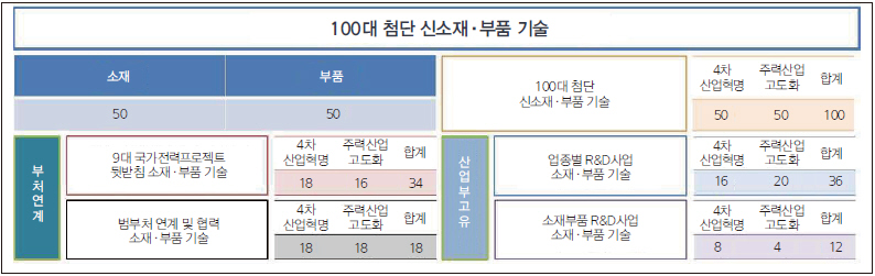 2025년까지 100대 신소재·부품 기술개발을 한다. 15개 소재·부품 관련 연구소 및 18개 산업분야별 PD가 참여하여 2025년까지의 ‘첨단 신소재·부품 기술개발 로드맵’을 수립하고 100개 기술을 도출했다. 4차 산업혁명 기반기술 및 연관 신산업 관련 기술 50개, 주력산업 고도화 뒷받침 관련 기술 50개이다.