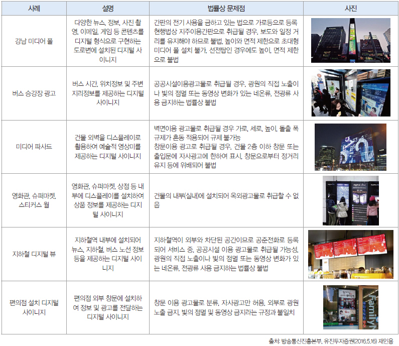 실제로 보면, 그동안 기존 법에서는 디지털 사이니지가 불법으로 취급되었다. <표 11>에서 보듯이 기존의 옥외광고물 규제 대부분은 불법 광고물에 대한 규제 강화 성격을 띠고 운영되었다.