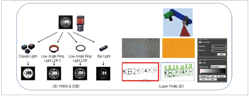 동일한 배경에 음각 또는 양각 문자 OCR을 진행하는 경우 그림 2와 같이 기존 2D 카메라에서는 검사에 필요한 이미지 획득을 위해서 조면 조건, 종류 등을 선택해야 하는 번거로움이 있다. 하지만, Laser Profile 3D Camera/Scanner를 이용해서는 소프트웨어 툴을 이용해서 검사에 필요한 이미지를 생성할 수 있기 때문에 2D 카메라 사용 시에 수반되는 번거로운 조명 선택 및 설치가 불필요하다.