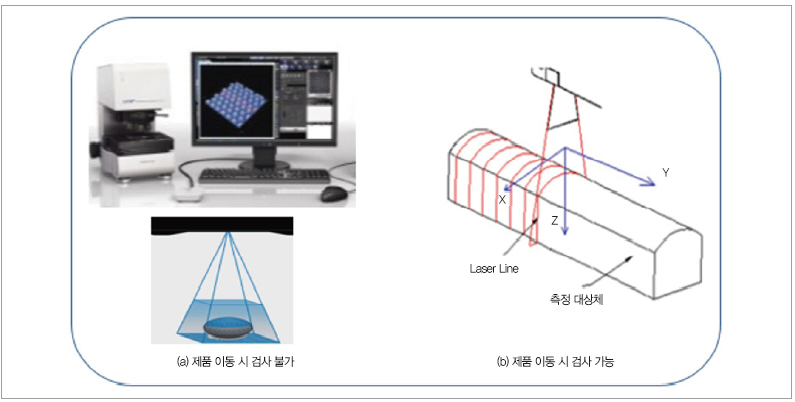그림 3(a)와 같이 Confocal, 스트레오 구조광 방식 등을 사용한 제품은 3D 영상을 획득하기 위해서는 제품 이동 중에는 불가하다. 하지만 그림 3(b)와 같이 Line Laser 방식을 적용한 제품은 단면을 촬영해서 3D 영상을 획득하기 때문에 In-Line 고속 이동 검사에 매우 적합하다.