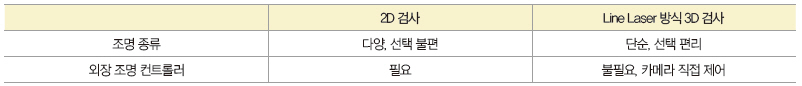 ▲ 표 1. 2D 검사와 Line Laser 방식 3D 검사 비교