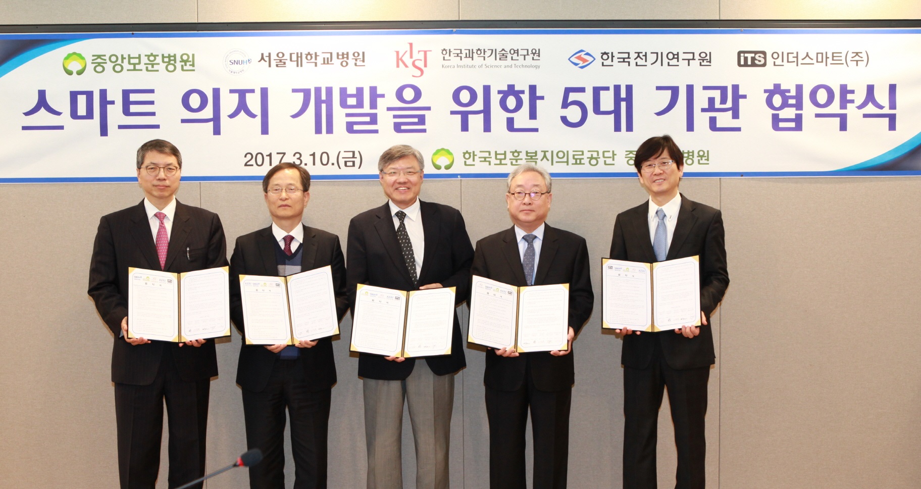 한국전기연구원(KERI·원장 박경엽)과 ㈜인더스마트, 중앙보훈병원, 한국과학기술연구원(KIST), 서울대학교병원 5개 기관이 3월 10일(금) 서울 강동구 중앙보훈병원에서 ‘스마트 의지 개발을 위한 협약’ 행사를 가졌다.