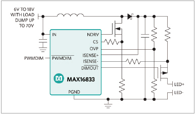 맥심 HB LED 드라이버 MAX16833 제품군(그림 2)은 스프레드 스펙트럼을 위한 주파수 디더링으로 EMI 제어 성능을 높여준다. 이 제품군은 하이빔?로빔?시그널 조명, 주간주행등, 안개등, 적응형전조등(AFLS)과 같은 다양한 차량용 조명 애플리케이션에 적합하다. 뿐만 아니라 LED 드라이버는 하네스(harness) 와이어링을 줄이고 강력한 결함 보호로 고전력 애플리케이션을 지원한다. 최대 65V 입력 전압 지원으로 시스템 부품 비용을 줄여준다.