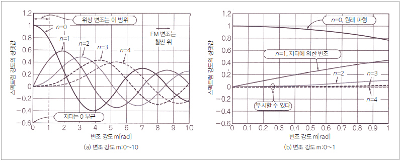 그림 9(a)는 제1종 베셀 함수의 그래프이다. 세로축은 출력되는 스펙트럼 강도의 상댓값, 가로축 m은 변조 강도이다. 신호 변조 주파수의 정수배 n으로 복수의 스펙트럼이 나타난다. 베셀 함수는 식으로 나타내면 어려워 보일 수도 있는데, 엑셀에서는 다음 식으로 그래프를 표시할 수 있다.