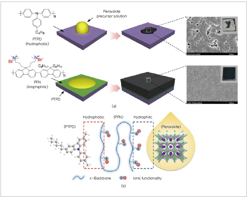 대면적에서 균질한 페로브스카이트 박막을 얻기 위해서는 유기전하수송층 표면의 표면에너지를 높여 전구체 용액의 젖음성을 개선해야 한다. 이광희 교수 연구팀은 공액 고분자 전해질이 분자구조 내에 탄소기반 벤젠 체인과 이온성 기능기를 갖고 있어 친수성질과 소수성질을 동시에 갖는 양친성(분자구조 내에 친수성과 소수성의 특성을 나타내는 분자를 동시에 지녀 친수성과 소수성 표면 모두와 잘 결합하는 특성) 특성을 보이는 데 착안해, 페로브스카이트 층과 유기전하수송층 사이에 계면 상용화제로 도입했다.
