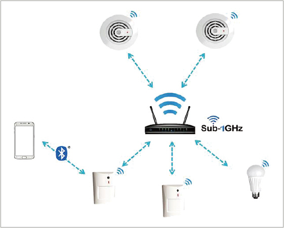 두 가지 경우 모두, Sub-1GHz 기술에 기초해 메인 네트워크를 두는 것이 주택이나 건물 전체를 포괄하는 데 좋다. 블루투스 저에너지 기술을 이 감지기에 추가하면 더 많은 옵션과 기능이 추가된다. 호텔의 모든 객실에 연기 감지기가 있다고 가정해 보자. 알람이 울리면, 각각의 연기 센서는 비상 대피로 정보를 알려주는 블루투스 저에너지 광고 메시지를 객실로 전송할 수 있으며, 청각 장애가 있는 사람의 경우 알람은 듣지 못해도 전화기의 진동은 느낄 수 있다.