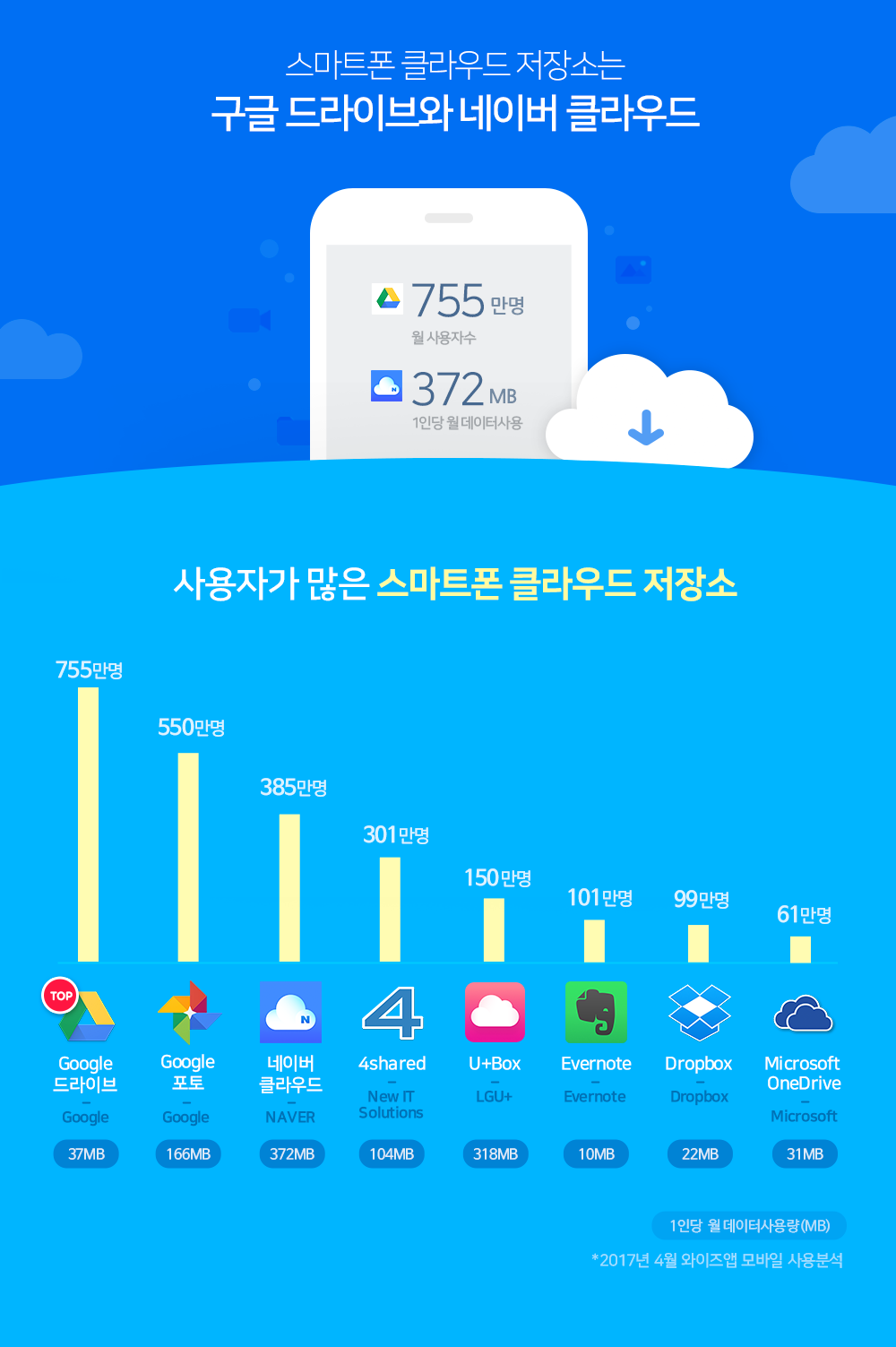앱 분석 업체 와이즈앱이 4월 한국의 모바일 클라우드 저장소 앱 사용자 수를 발표했다.