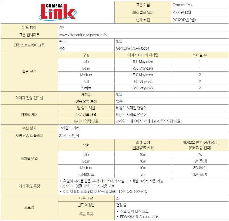 Camera Link 표준은 2000년에 처음 발표됐다. 데이터 전송, 카메라 타이밍, 시리얼 통신, 카메라 실시간 신호 전송 등을 위한 규정을 포함한 카메라와 프레임 그래버 간의 연결을 표준화하고 완벽한 인터페이스를 정의한 견고하고 확실히 자리를 잡은 통신 링크다. Camera Link는 비패킷 기반 프로토콜로 가장 간단한 카메라/프레임 그래버 상호 연결 표준을 유지한다. 현재 2.0 버전에서 이 표준 사양은 Mini Camera Link 커넥터, PoCL(Power over Camera Link), PoCL-Lite (Base 구성을 지원하는 PoCL 인터페이스), 케이블 성능 사양 등을 포함한다.