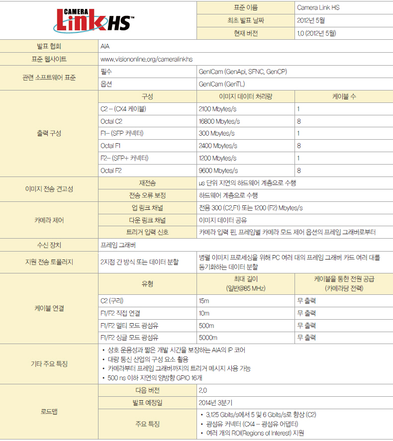 Camera Link HS 표준은 2012년 5월에 발표되었고, 대역폭 향상과 케이블 길이를 늘일 수 있도록 기성 케이블을 사용하여 Camera Link를 향상한 표준이다.