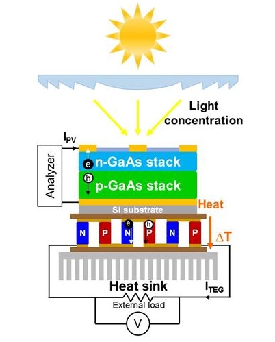 본 KIST-UNIST 공동연구진은 기존의 집광형 태양전지가 발생하는 열 때문에 효율이 저하되는 문제를 해결하기 위해 열을 전기를 바꿀 수 있는 열전 소자를 집광형 태양전지와 융합하는 기술에 관한 아이디어를 구상하고 이를 융합전지로 구현하였다.