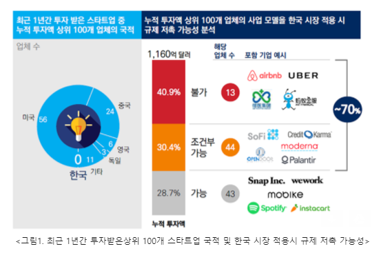 보고서에 따르면, 2016년 초 미국의 시장조사기관인 CB Insights가 선정한 세계 100대 스타트업 가운데 한국 업체는 단 1곳에 그쳤고, 최근 1년간 투자 받은 스타트업 중 누적 투자액 상위 100개 업체의 혁신 사업 모델 중 누적 투자액 기준 70%에 이르는 사업이 국내에서는 규제에 저촉될 가능성이 있는 것으로 분석됐다.