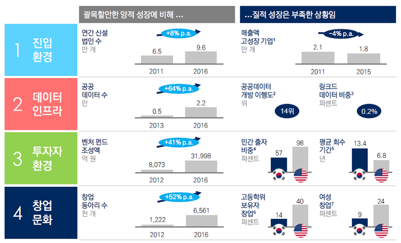 특히, 한국 스타트업은 2011년 6만 5000개의 법인이 신설되었던 것에 비해 2016년에는 9만 6000개로 증가하는 등 몇 년 새 양적으로 급속히 팽창하고 있으나, 세계 기업가정신 지수가 여전히 세계 27위에 머물고 있고 민간 자본 투자, 데이터 인프라, 창업 문화 등 질적인 측면에서의 성장이 필요한 시기라고 보고서는 평가했다.
