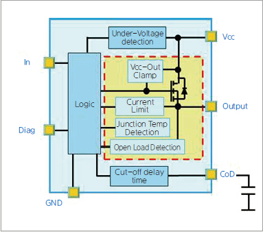 그리고 개방 드레인 트랜지스터를 통해 진단 기능도 제공하는데, 접합부 열 셧다운, 컷오프, 오프 상태의 개방 부하(와이어 끊김) 시에는 이 개방 드레인 트랜지스터가 턴온된다. 빠른 자기소거 회로가 내부적으로 통합되어 매우 큰 인덕티브 부하를 구동할 수 있다.