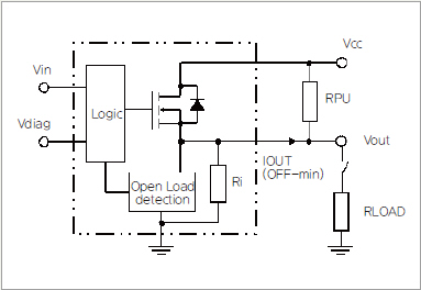 이 디바이스를 기반으로 한 STEVAL-IFP028V1 데모 보드는 IEC 61000-4-2(정전기 방전 테스트), IEC 61000-4-4(버스트 테스트), IEC 61000-4-5(서지 테스트)를 충족한다. 앞서 언급했듯이, IPS160H는 개방 부하 검출 기능을 제공하므로, 부하가 출력 핀으로부터 차단되었을 때 이를 검출한다. 이 기능은 출력과 Vcc 핀 사이의 저항(RPU)에 의해 작동된다(그림 3). 와이어 끊김이 발생되고 오프 상태(입력 낮음)이면 출력 전압 VOUT이 외부 풀업 저항(RPU)과 이 IC의 내부 저항(RI = 115kΩ) 사이의 파티셔닝에 따라 상승한다.