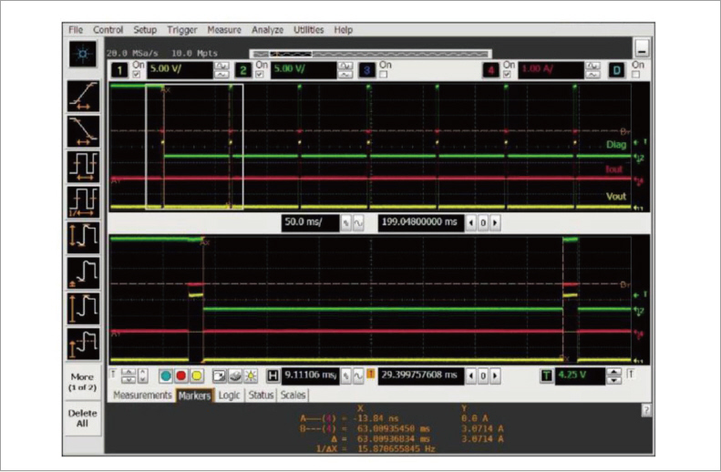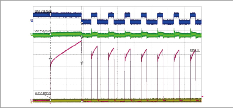 ▲ 그림 5. 과열 보호, Vcc=60V(파란색=Vdiag, 녹색=Vout, 빨간색=Iout)