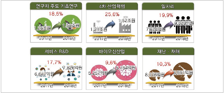 정부는 내년에 14조 5,920억원을 주요 국가연구개발사업에 투자하여 4차 산업혁명 대응을 통한 미래성장동력 확충에 주력하고, 과학기술 기초체력 강화를 위한 연구자 주도 기초연구 지원을 확대한다. 또한 미세먼지, 감염병, 치매 등 국민 삶의 질 향상과 밀접한 문제의 과학기술적 솔루션 확보를 위한 투자를 확대하고, 일자리 창출 효과가 높은 인력양성, 창업지원 등의 R&D에 대해 우선 투자하기로 했다.