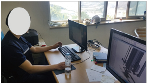 또 사진 2를 보면, 젊은이가 갠트리 타입 로봇을 활용하여 금형을 가공하며 냉각시키는 프로그램을 로봇으로 시뮬레이션하고 로봇에게 원격으로 가공 지시를 내리는 모습이다.