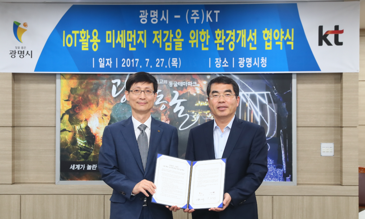KT(회장 황창규)와 광명시(시장 양기대)는 미세먼지 등 대기오염 문제를 체계적으로 해결하고 지역의 효율적인 공기질 관리를 위해 ‘IoT 활용 미세먼지 환경 개선 협약’을 체결했다.