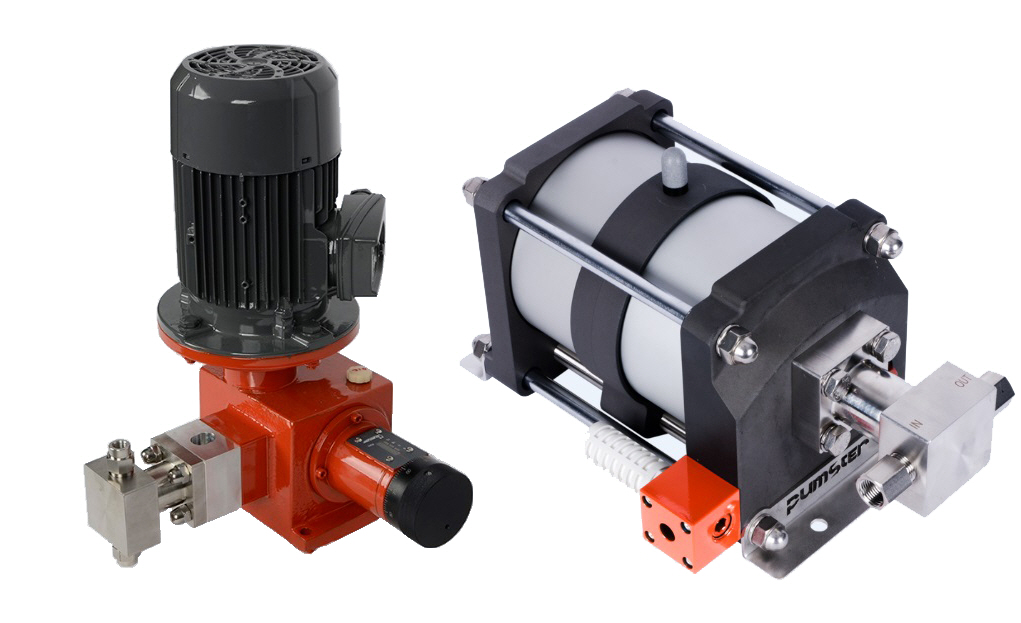고압, 시험, 유압 시스템을 공급하는 펌스터의 펌프 라인 중 리퀴드 펌프는 액체 상태의 물질들을 다른 위치로 이송하거나 승압하는 용도로 사용하는 제품이다. 이 펌프는 에어 구동 방식을 통해 구동부에서 피스톤이 직선 왕복 운동하며 고압부 IN 체크 쪽으로 물, 오일 등이 주입되고 OUT 체크 쪽으로 빠져나가 고압을 형성하는 원리로 이루어져 있다. 그리고 메터링 펌프는 일정한 부피의 액체를 정확하게 배출하는 펌프로서 왕복 펌프가 대표적이다. 이 제품은 일반적으로 피스톤 대신 플런저를 사용해 행정마다 일정량의 액을 보낸다.
