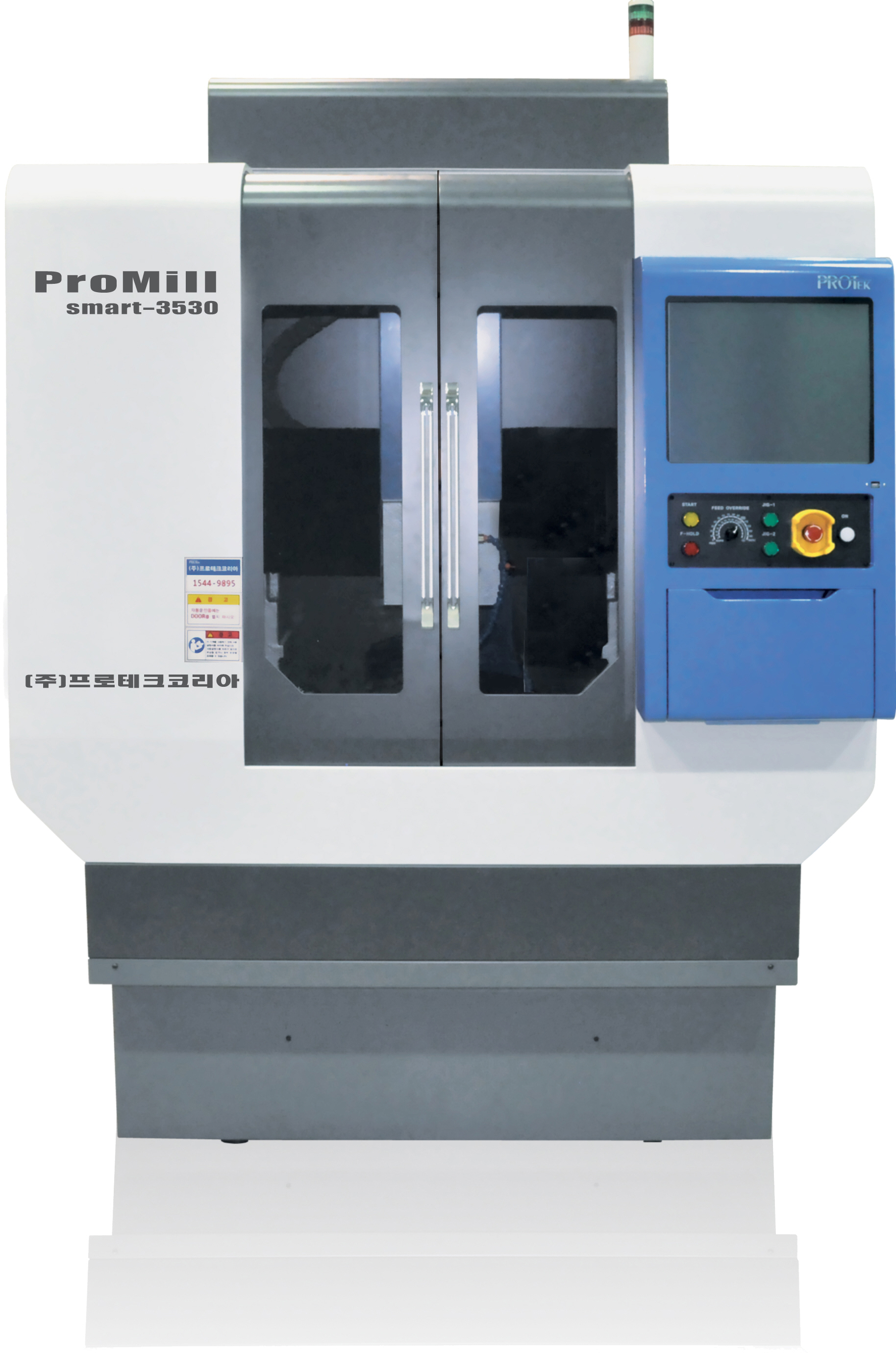 프로테크코리아의 Smart3530/5040은 핸드폰 가공 및 다이아 커팅기 겸용으로, 홀 가공과 배면 가공을 동시에 수행할 수 있고, 가공에 필요한 기능과 편의사항이 탑재되어 있으며, PC(Polycarbonate) 계열 및 알루미늄, 마그네슘 등 최적 가공을 위한 고속가공기이다. 전체 주물 구조로 진동과 소음을 최소화했고, ACT 장착으로 5개(10개 옵션)의 공구 교환 터치 센서를 사용해 전문 관리자 없이도 안정된 공구 교환이 가능하다. 또한 스핀들에 별도의 안전센서를 장착함으로써 스핀들 충돌을 방지한다.