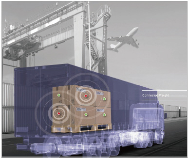 Connected Freight(그림 2) 경우, 화물에 온도 또는 진동과 같은 다양한 환경 조건을 감지하는 비용 효율적인 센서 태그를 붙이고 차량에 게이트웨이를 탑재함으로써 위성을 통해 추적이 가능한 솔루션으로, 중요한 화물의 위치와 상태에 대해 실시간으로 정보를 제공할 수 있다. 고객에게 자세한 분석을 제공하여 즉시 계획, 예상 및 대응할 수 있다.
