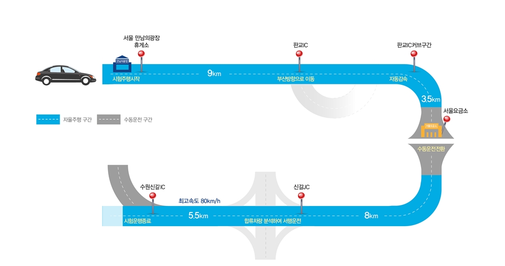 다시 자율주행 모드로 전환해 수원신갈 IC까지 약 13.5km를 더 주행한 후 오전 7시 48분 시험 주행을 마쳤다. 수원신갈 요금소는 수동운전으로 통과했다.