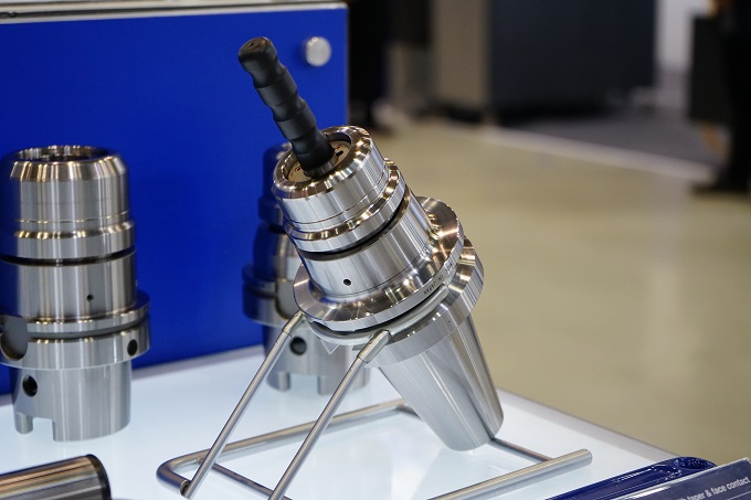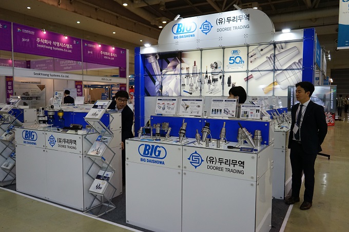 이번 전시회에는 2면 구속 시스템이 적용된 빅플러스의 스핀들 척을 주력으로 소개했다. 2면 구속 시스템은 스핀들이 연결되는 테이퍼와 단면을 밀착시켜 2면 구속이 되는 방식으로, 가공 치수 정확도가 향상되고 고속 회전이 보다 안정적이라는 장점이 있다. 다른 제품군인 유압 척은 강성 및 정도 중시의 일체형 구조로 설계돼 있다. 이 구조는 흔들림 정도를 3미크론(μm) 이하까지 구현할 수 있다. 두리무역은 이 외에도 고속 회전 홀더, 마이크로 척, 콜렛 척 등 다양한 툴링 시스템을 선보였다.