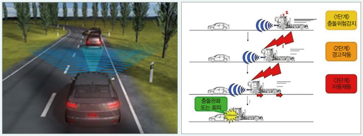 ▶비상자동제동장치(AEBS: Advanced Emergency Braking System): 주행차선의 전방에 주행 중이거나 정지한 자동차를 감지해 운전자에게 경고를 주고 자동으로 제동함으로써 충돌을 완화하거나 회피하는 장치로, 위험상황에서 시스템이 자동적으로 최대감속도의 약 30%에 해당하는 제동을 제공함으로써 사고예방 및 사고심각도 감소에 기여한다.