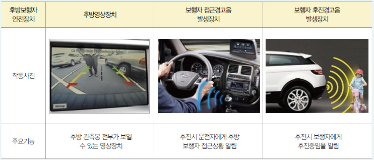 둘째, 자동차 후진 시 후방시계 확보가 어려워 발생하는 보행자 사고를 예방하기 위해 일부 차종에만 설치하는 후방보행자 안전장치를 모든 자동차에 설치하도록 하고, 운행 소음이 작아 보행자가 자동차의 접근 여부를 알기 어려웠던 전기차 등 저소음자동차에 경고음 발생장치를 설치하도록 하여 자동차의 접근 여부를 쉽게 알 수 있도록 함으로써 사고를 방지하는 등 보행자 안전을 강화하였다.