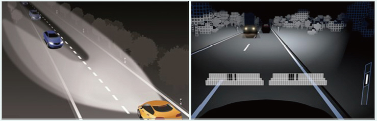 ▶적응형 전조등(ADB : Adaptive Driving Beam): 대향차 운전자의 눈부심 감소 및 주행 운전자의 전방 인지거리 증가를 위해 자동으로 빛이 조절되는 전조등이다.
