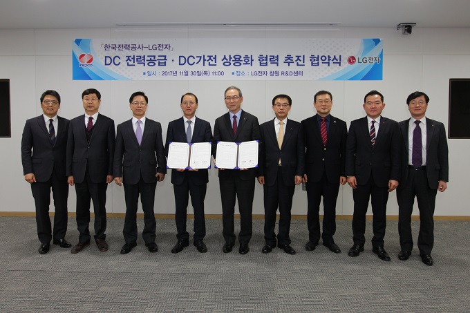 한국전력과 LG전자는 11월 30일(목) LG전자 창원 R&D센터(경남 창원시 소재)에서 한전 김시호 부사장, LG전자 H&A사업본부장 송대현 사장 등이 참석한 가운데 ‘DC전력공급 · DC가전 상용화 협력을 위한 협약’을 체결했다.