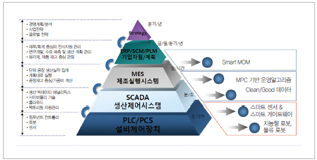 스마트공장 제조운영 아키텍처는 설비제어장치(PLC/PCS), 생산제어시스템(SCADA), 제조실행시스템(MES), 기업자원 및 계획(ERP/SCM/PLM), 전략, 5단계로 구성되며 각 시스템 도입 시 단계별 우선순위를 고려하게 된다. 그리고 기업의 생산 전략에 맞는 도입 순서를 결정하고 기업의 수준과 업종에 맞는 우선순위를 고려한다.