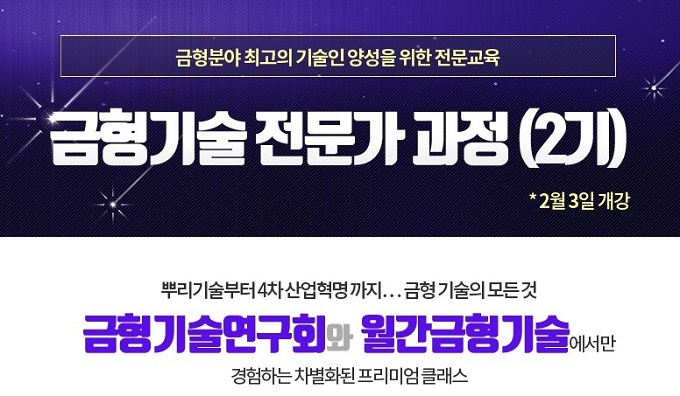 금형기술전문가 과정 2기 교육은 오는 2월3일부터 4월28일까지 12주 동안 매주 토요일마다 6시간씩 총 72시간으로 진행되며, 오는 19일까지 사전등록을 받는다.