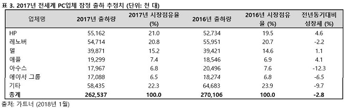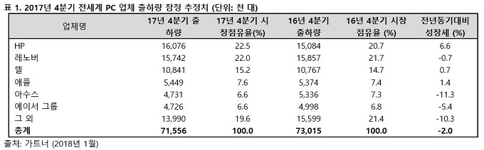 IT 자문기관 가트너(Gartner)는 2017년 4분기 전세계 PC 출하량의 예비 조사 결과가 2016년 동기 대비 2%가 감소한 총 7,160만 대를 기록할 것이며, 2017년 전체 PC 출하량은 2.8% 감소해 총 2억 6,250만 대 이상을 기록할 것이라고 잠정 발표했다.