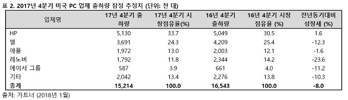 미국의 2017년 4분기 PC 출하량은 전년 동기 대비 8% 감소한 1,520만여 대를 기록했다. 상위 5대 PC 업체 중 4개의 업체가 2017년 4분기 미국 시장 내 PC 출하량이 감소했다. 이번 분기에 HP가 유일한 증가세를 보였다. PC 출하량은 연말 세일 시즌에도 불구하고 낮았던 소비자 수요로 인해 감소세를 보였다.