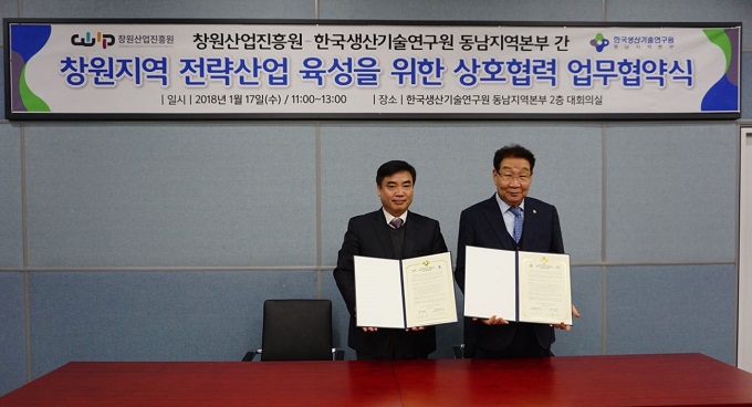 한국생산기술연구원 동남지역본부가 17일 창원산업진흥원과 창원 지역 전략산업 육성 및 미래형 첨단 소재·부품산업 전문(희망) 기업 발굴을 위해 상호 간 협력 체계를 구축하는 협약을 체결했다.
