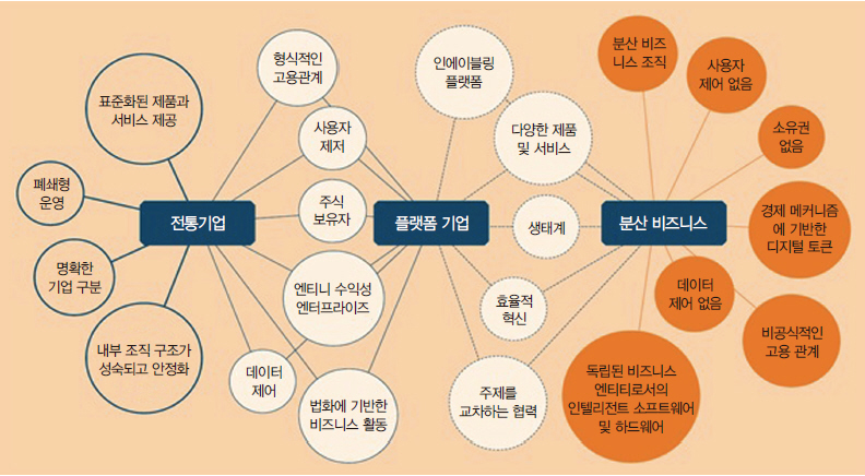 ▲ 전통 기업, 플랫폼 기업, 그리고 분산비즈니스의 비즈니스 활동 비교