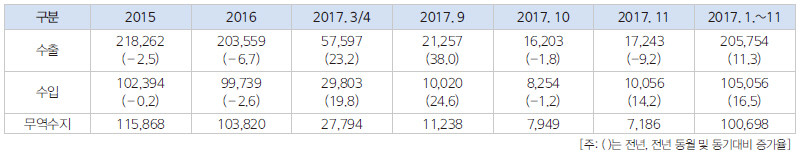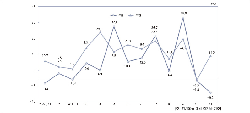 2017년 11월 기계산업, 전년비 수출 줄고 수입 늘어