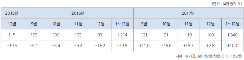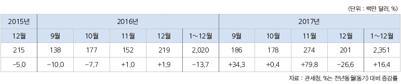 2017년 한 해 공작기계 수출은 23억5,200만 달러로 전년 대비 16.4% 증가하였다.