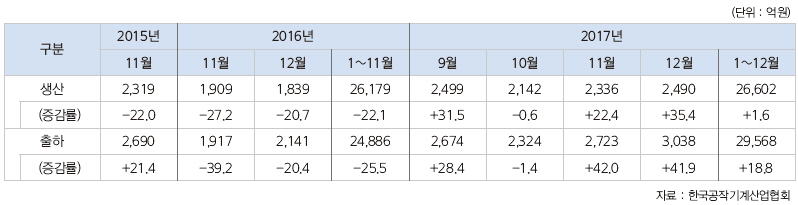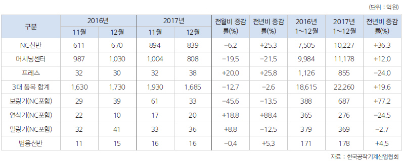 2017년 한 해 공작기계 생산은 2조6,602억원으로 전년동기 대비 1.6% 증가하였으며, 출하는 2조9,568억원으로 18.8% 증가했다.