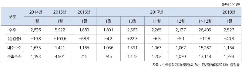2018년 1월 공작기계 수주는 2,527억원으로 전월 대비 18.2% 증가하였으며, 전년동월 대비 40.3% 증가하였다. 내수 수주는 1,134억원으로 전월대비 6.2%, 전년동월 대비 7.4% 증가하였다. 수출 수주도 1,393억원으로 전월 대비 30.1%, 전년동월 대비 86.9% 증가하였다.