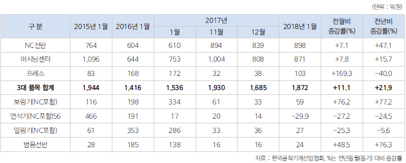 2018년 1월 품목별 수주를 보면, NC절삭기계는 전월 대비 16.4% 증가한 2,347억원, 성형기계는 161.1% 증가한 107억원을 기록했다. 반면 범용절삭기계는 전월 대비 9.7% 감소한 72억원을 기록했다.